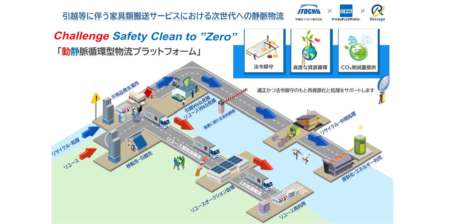 アートセッティングデリバリーの豊富な顧客接点力と、きめ細やかな現場作業、リステージホールディングスの査定・買取/ネットオークション運営の強み、そして伊藤忠メタルズが半世紀以上培ってきた再資源化・産廃管理の実績と高度なインフラ・ネットワーク(全国十数所の整備・保管拠点、数百社の産廃処理ネットワーク、法令遵守支援、電子マニフェストシステム)といった3社の強みとノウハウを結集してCO₂削減量や廃棄物の再資源化率の見える化、並びに廃棄・環境破壊リスク低減と、お客様の利便性向上やSDGs/ESGへの対応を推進します。