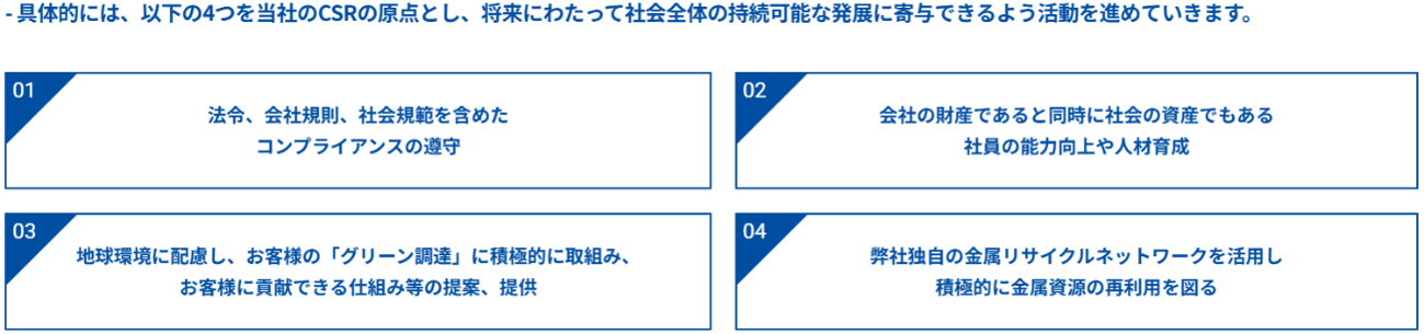 伊藤忠メタルズ株式会社は伊藤忠グループの一員として、グループ企業理念である「三方よし」のもと、事業活動を通じ環境や社会問題に対応することで持続可能な社会の実現にこれからも貢献します。