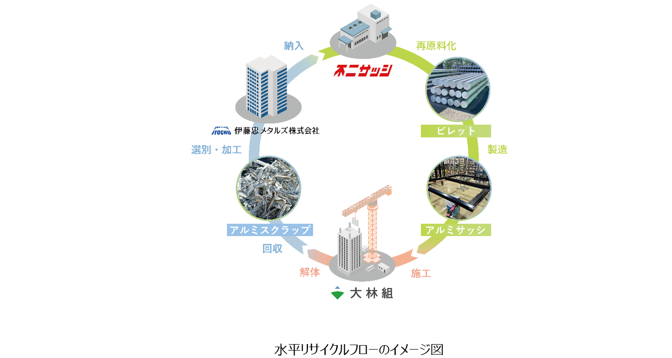 伊藤忠メタルズ株式会社(本社:東京都港区、社長:中谷次克)は株式会社大林組(本社:東京都港区、社長:佐藤俊美)と、建設資材における循環型経済・脱炭素社会の実現に向けた取り組みの一環として、不二サッシ株式会社(本社:神奈川県川崎市、社長:江崎裕之)と連携し、大林組が請け負う解体工事で発生するスクラップからアルミ材を選別回収して、アルミサッシに再生し、再び大林組の建設現場で利用するまでのトレーサビリティを明確にした水平リサイクル(※1)フローを構築しました。
